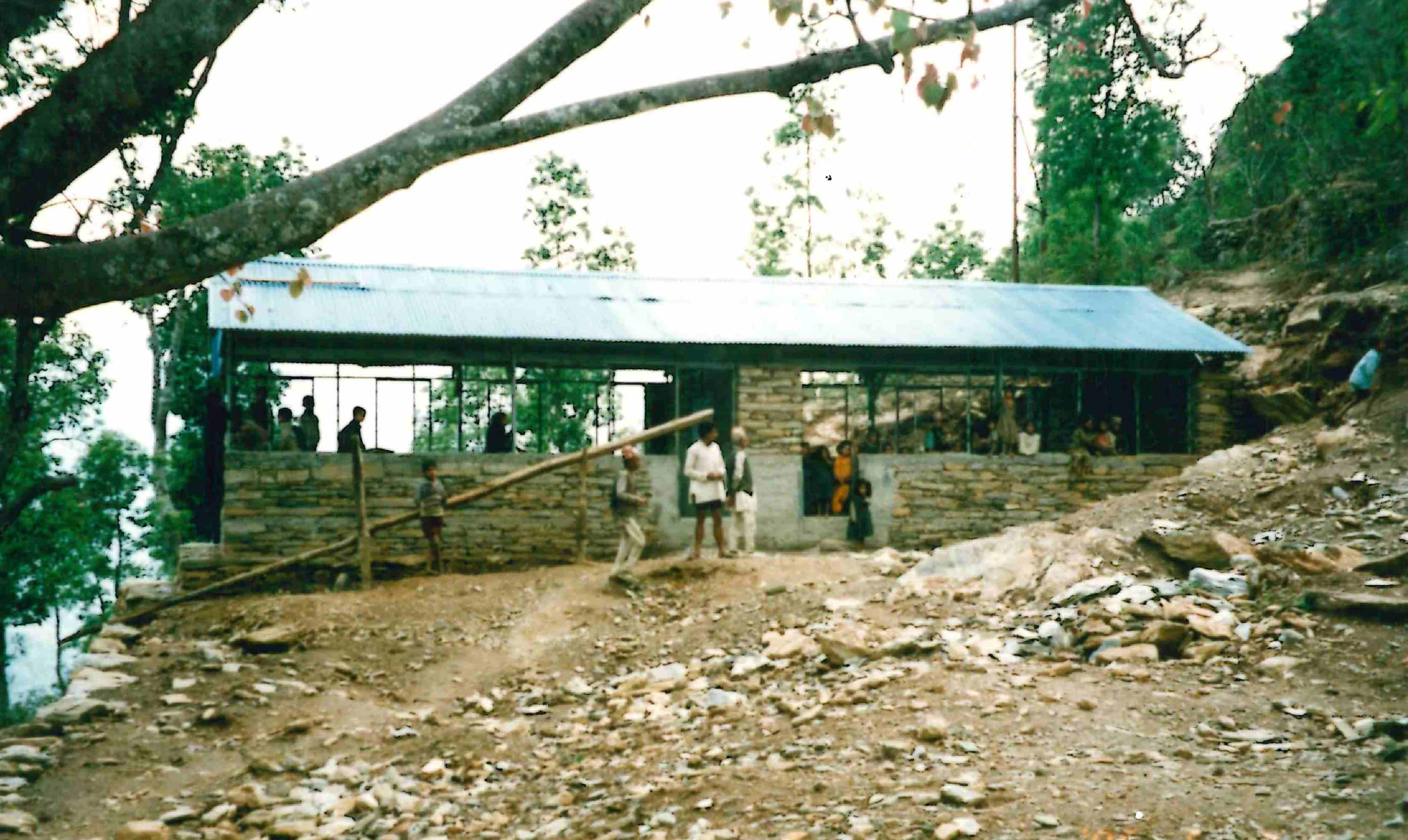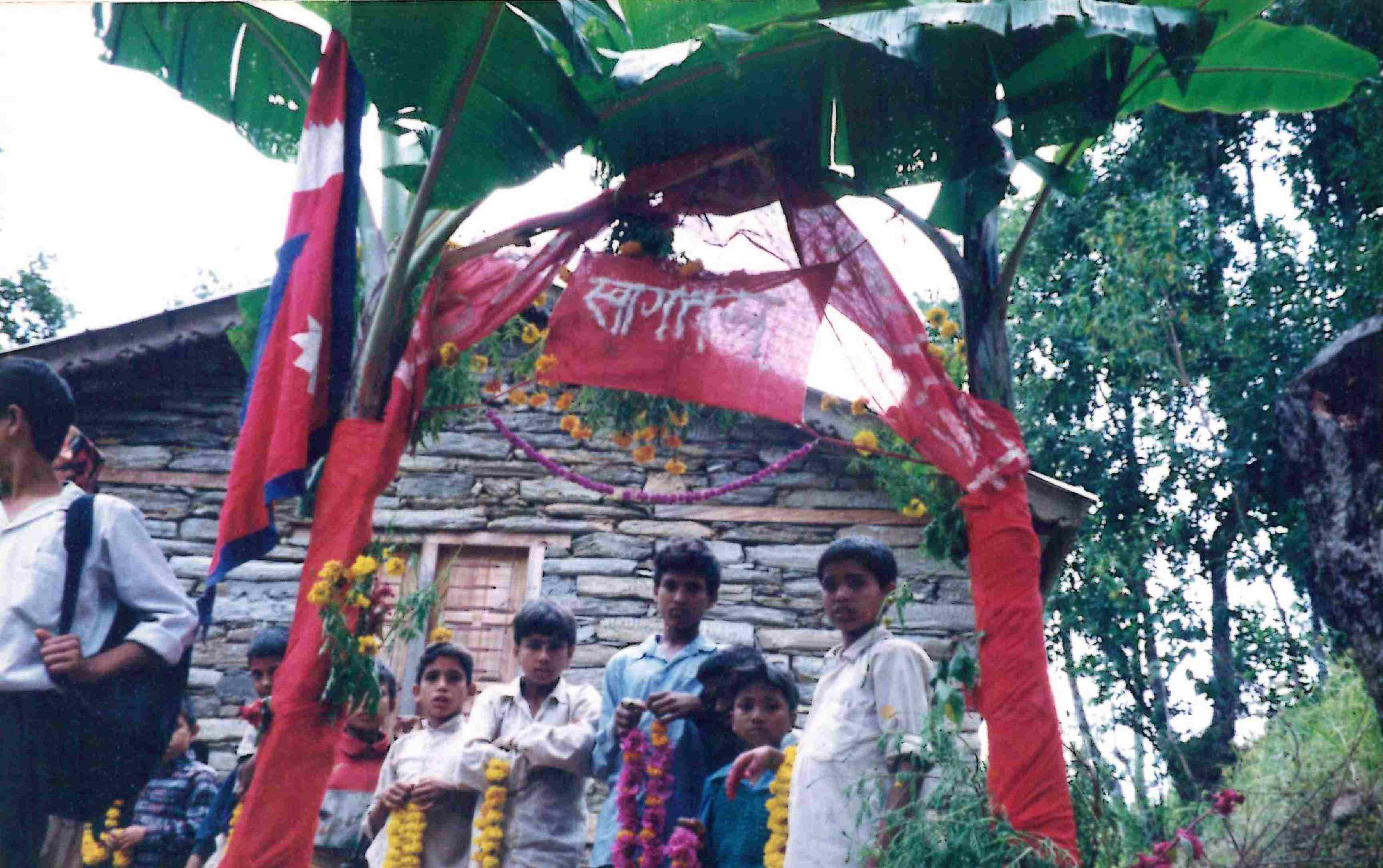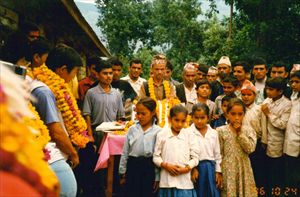 設立した1996年当時の、カリカ小学校落成式の写真です。村人と、その子供たちもお祝いしてくれました。